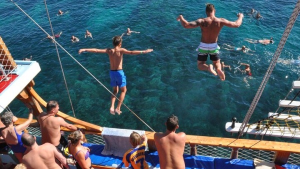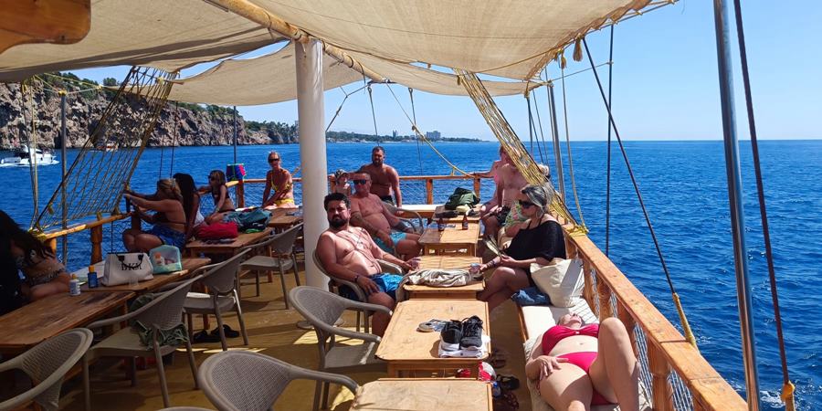 Wsiądź na dwupiętrowy turecki gulet (pojemność 120 osób) i wypłyń o 10:00 z Portu Alanya. Rejs po wybrzeżu Morza Śródziemnego, mijając Zamek Alanya z widokami na bujne klify i lazurowe wody. Zrelaksuj się na przytulnych siedzeniach lub opalaj się na pokładzie, chłonąc spokojną atmosferę. 🌊
