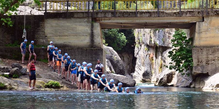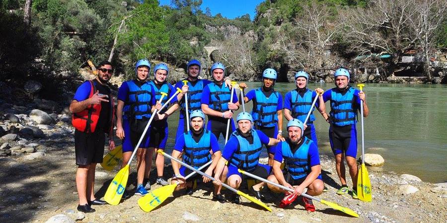 Udaj się do centrum raftingu na rzece Köprüçay na wielojęzyczną odprawę bezpieczeństwa. Wyposaż się w kaski, kamizelki ratunkowe i wiosła; wypożycz kombinezony lub buty (około 5-10 €) dla wygody. Grupy 6-8 osób (sortowane według języka, dzieci siedzą centralnie) wsiadają na tratwy z profesjonalnymi kapitanami. Spróbuj szybkiej kąpieli w ciele, aby poczuć wody topniejącego śniegu o temperaturze 10-12°C.